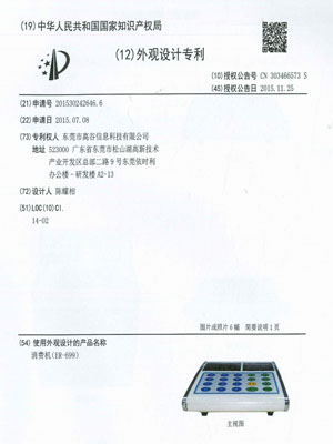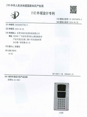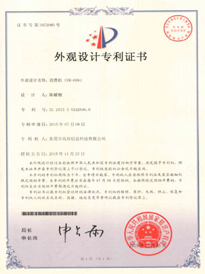 消费机-外观设计专利证书