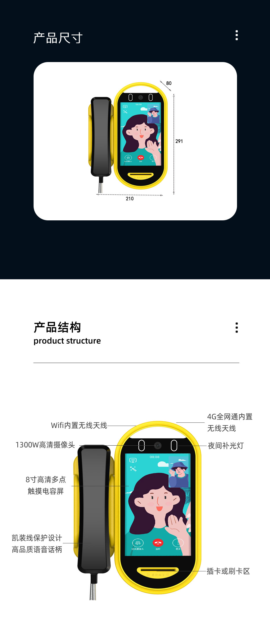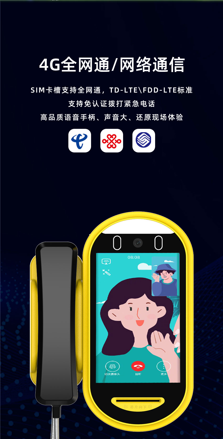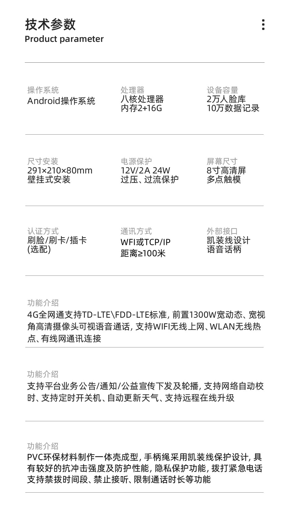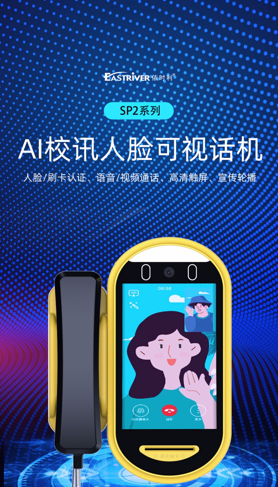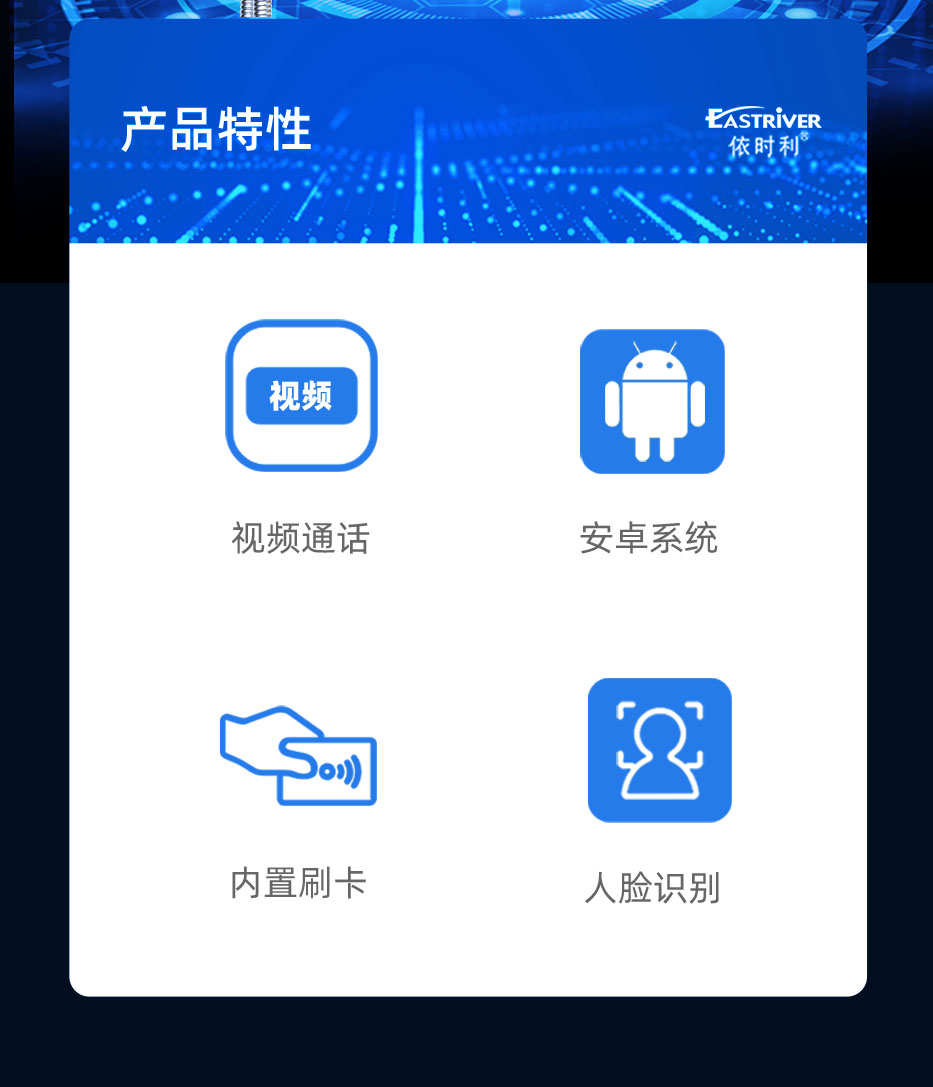 “依时利EASTRIVER”品牌AI人脸可视亲情话机SP2系列是我们自主研发生产的校园视频话机(也称校园亲情话机,学校可视话机),我们追求极致品质,采用国际一流工业设计标准。校园视频话机采用世界领先的人脸特殊3D算法,配合高速处理器,具有人脸识别速度快、识别距离远、单目镜头,2万人脸库、 超大语音播报等特点,支持人脸识别/刷校园卡打电话;我们是校园亲情话机源头生产厂商,可免费提供“校园视频话机”硬件API接口文档,并协助进行对接开发。可以支持学校定制动态活体人脸识别应用产品如人脸识别应用考勤系统、人脸识别门禁系统、人脸识别闸机、人脸识别消费、无线人脸门锁等需求。
