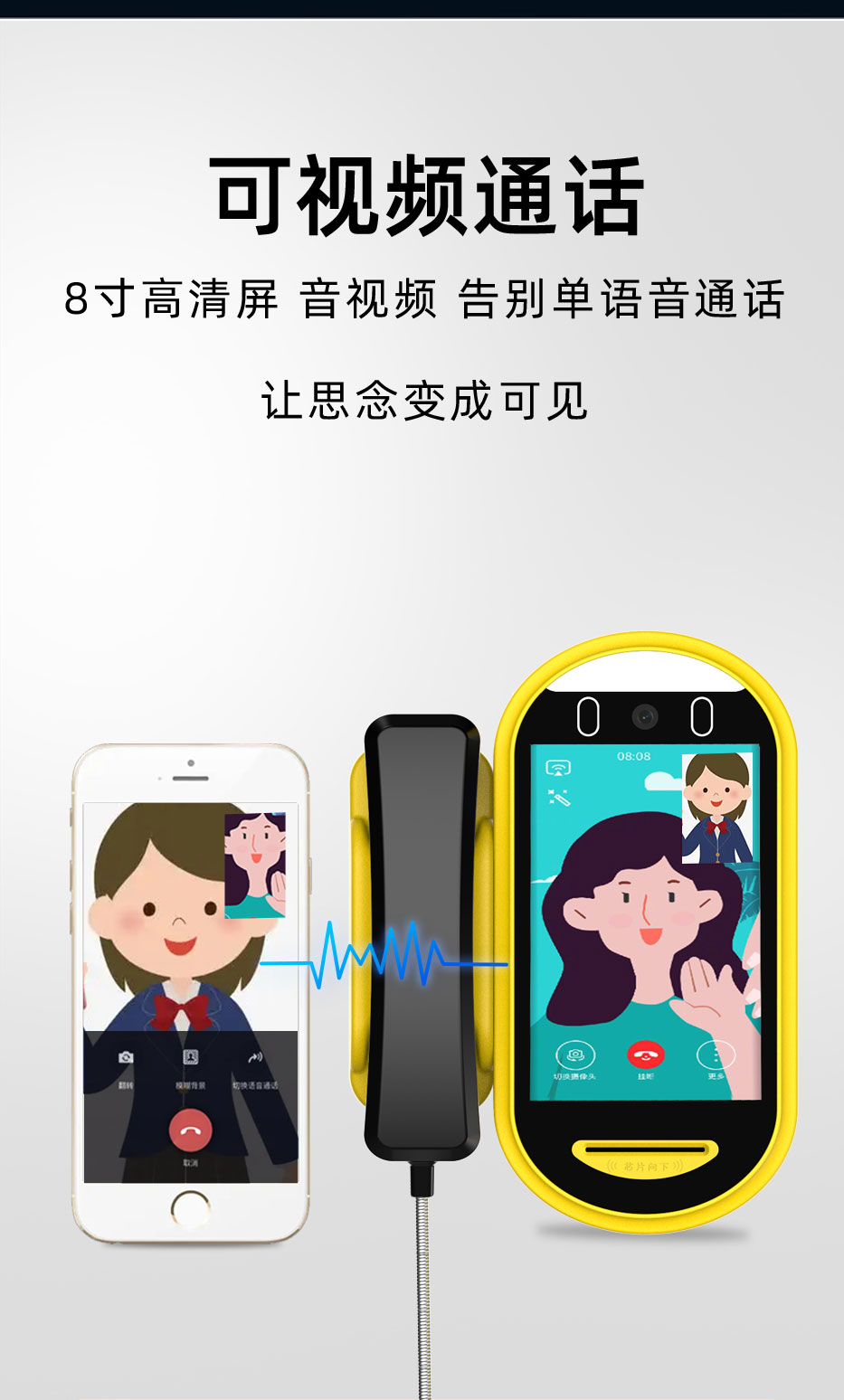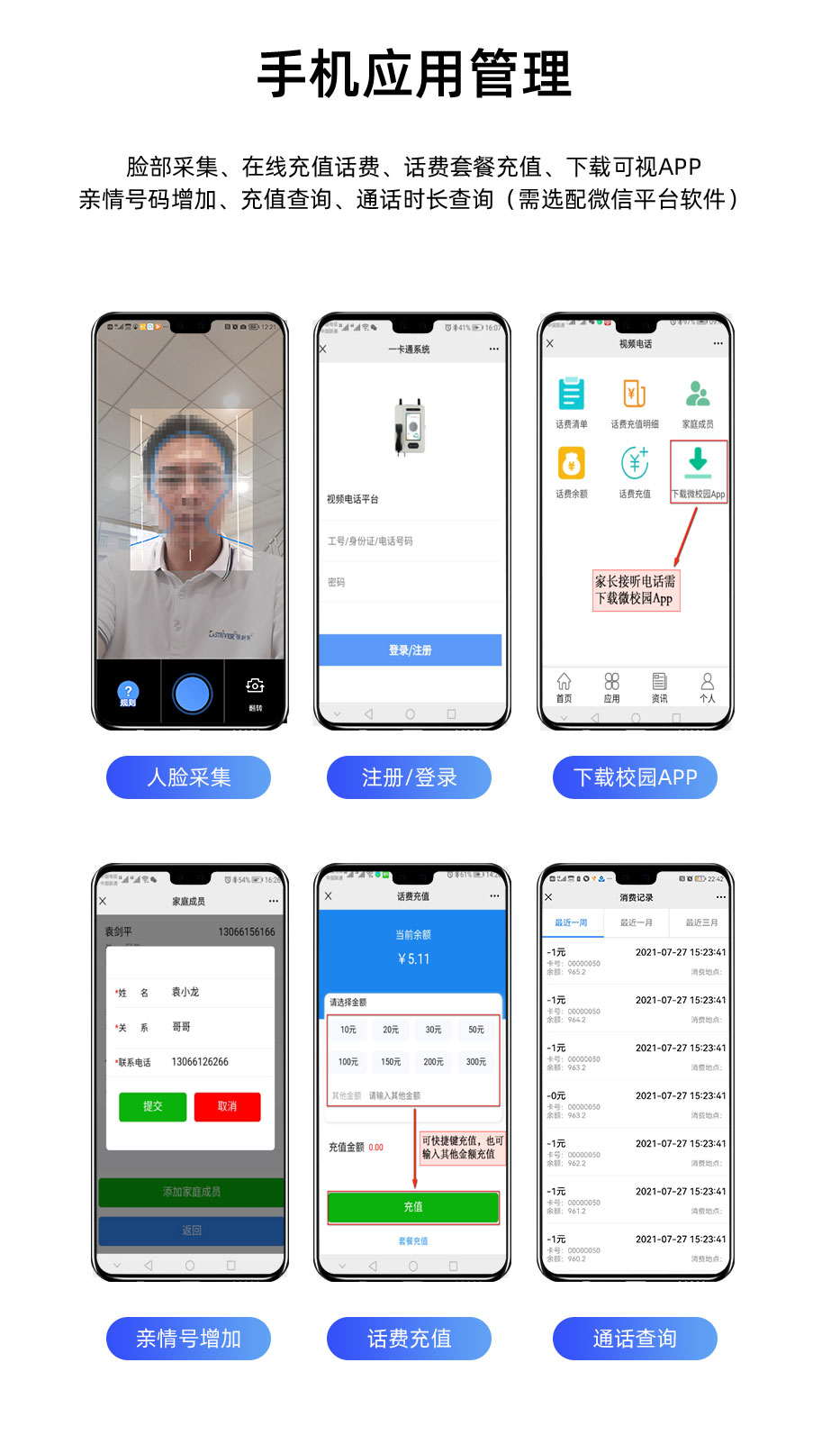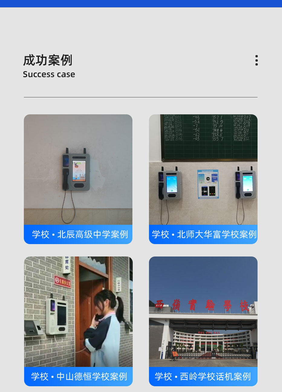 校园视频话机采用人脸识别,支持手机端在线充值;一个学生可添加多个亲情号码,快速选择联系家长。视频话机,即使不带手机也可以实现语音或者视频联系。