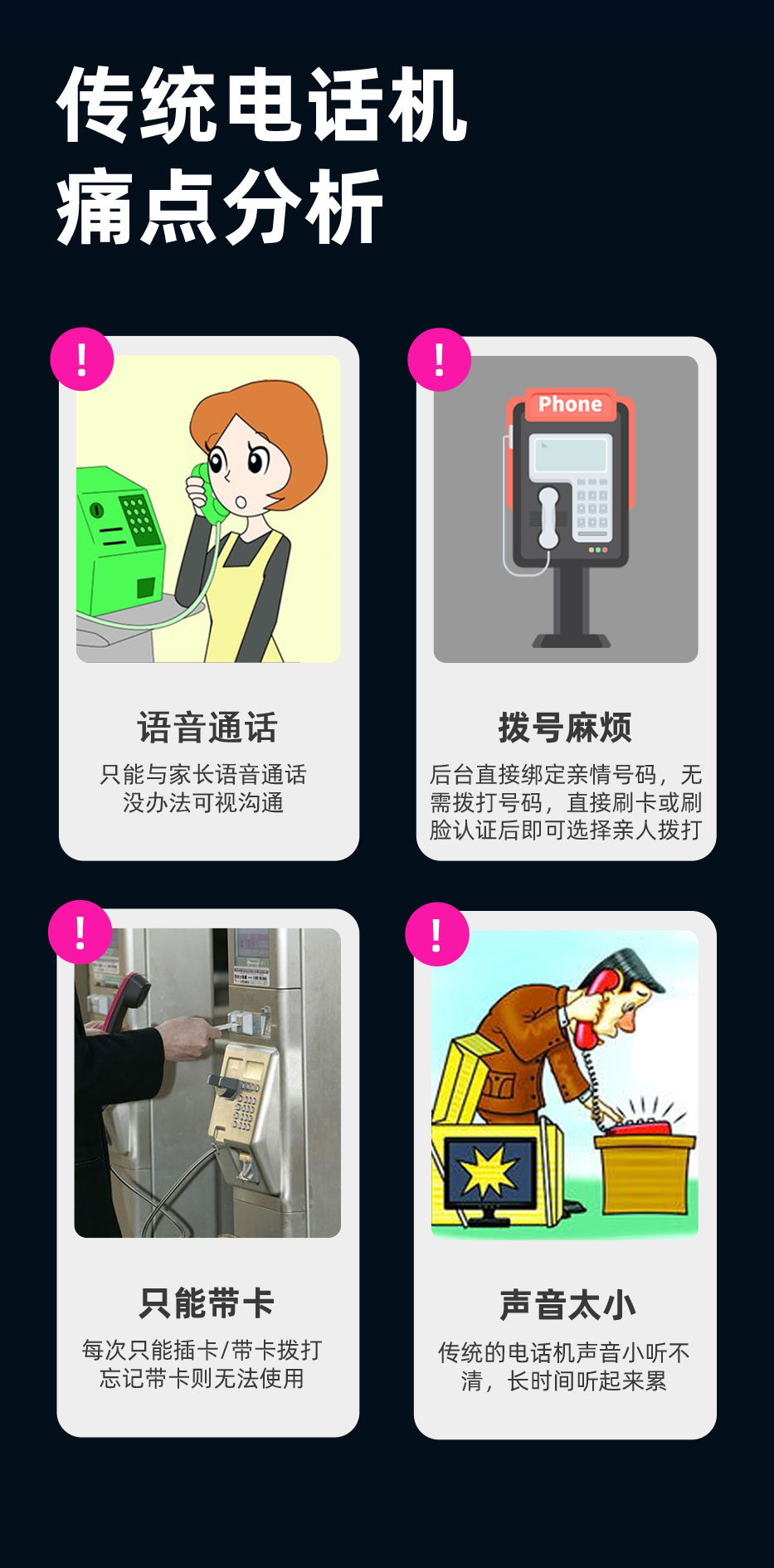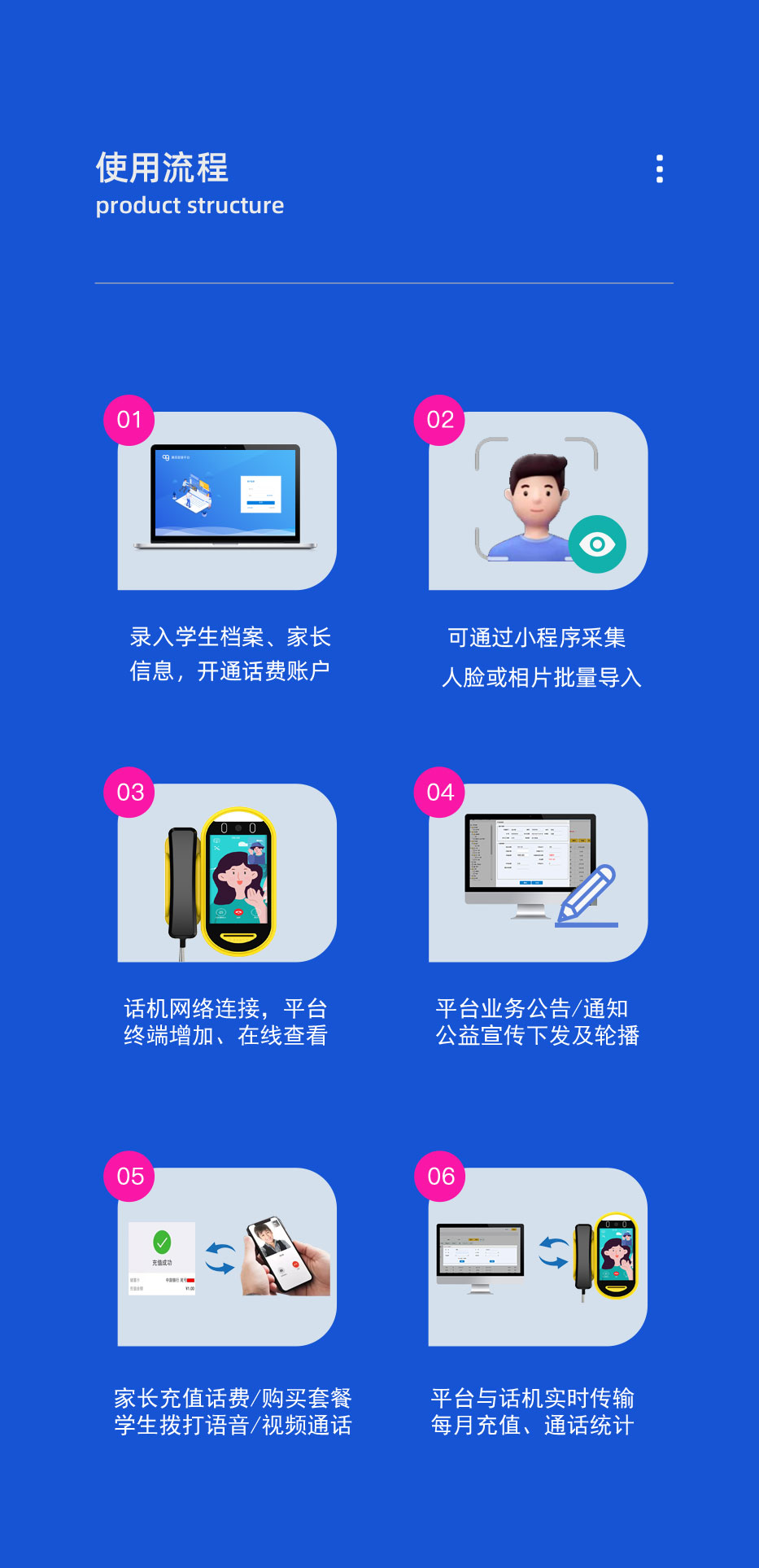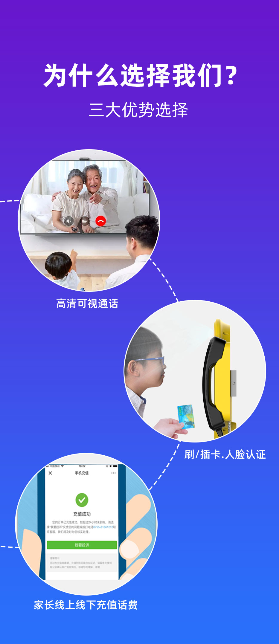 校园视频话机采用人脸识别,支持手机端在线充值;一个学生可添加多个亲情号码,快速选择联系家长。视频话机,即使不带手机也可以实现语音或者视频联系。