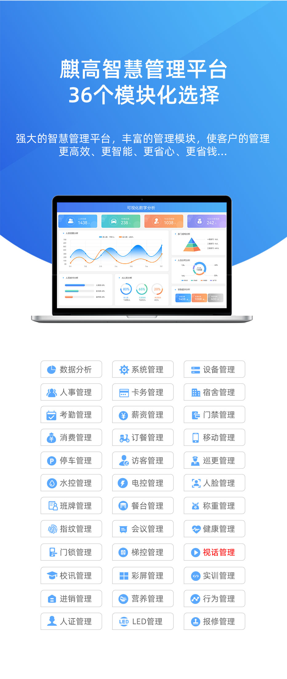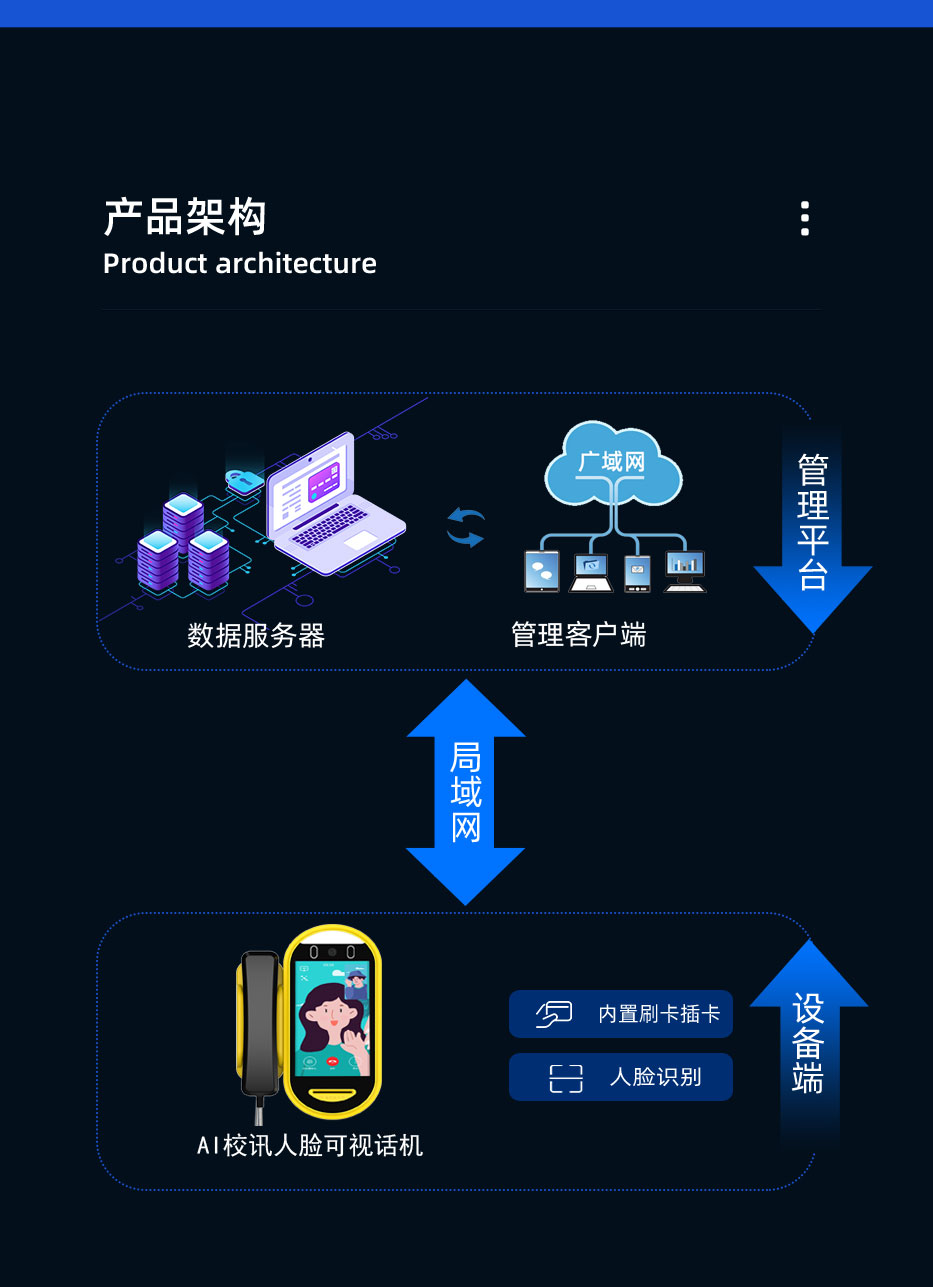 人脸识别校园话机可应用于人脸识别相关生态系统,依时利人脸机接入的平台系统可扩展用于人脸识别考勤管理、人脸识别消费管理、停车管理、人脸识别访客管理、人脸识别通道管理、人脸识别电梯管理、人脸识别门禁管理、人脸识别管理、会议管理、食堂管理、人脸识别订餐管理、人脸识别点餐管理、宿舍管理、水控管理、电控管理、短信管理、邮件管理、自助充值管理、手机APP管理、自助服务管理等20个应用模块。平台统一系统管理,一卡一库架构,支持模块式叠加功能,全面形成“卡码脸”数智化平台,支持个性化定制。