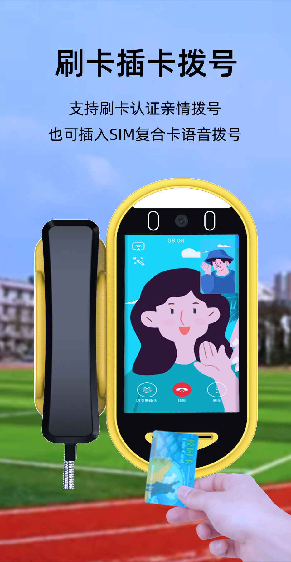 校园视频话机,同时支持人脸、卡两种不同的识别模式,可以同时满足不同应用场景。采用先进的人脸识别、4G通信技术为学校与家长搭建起更加完善、方便的沟通桥梁,具有识别速度快、识别准确度高、免接触、无损耗、技术先进、系统扩展性好、等优点,特别适合学校管理使用。
