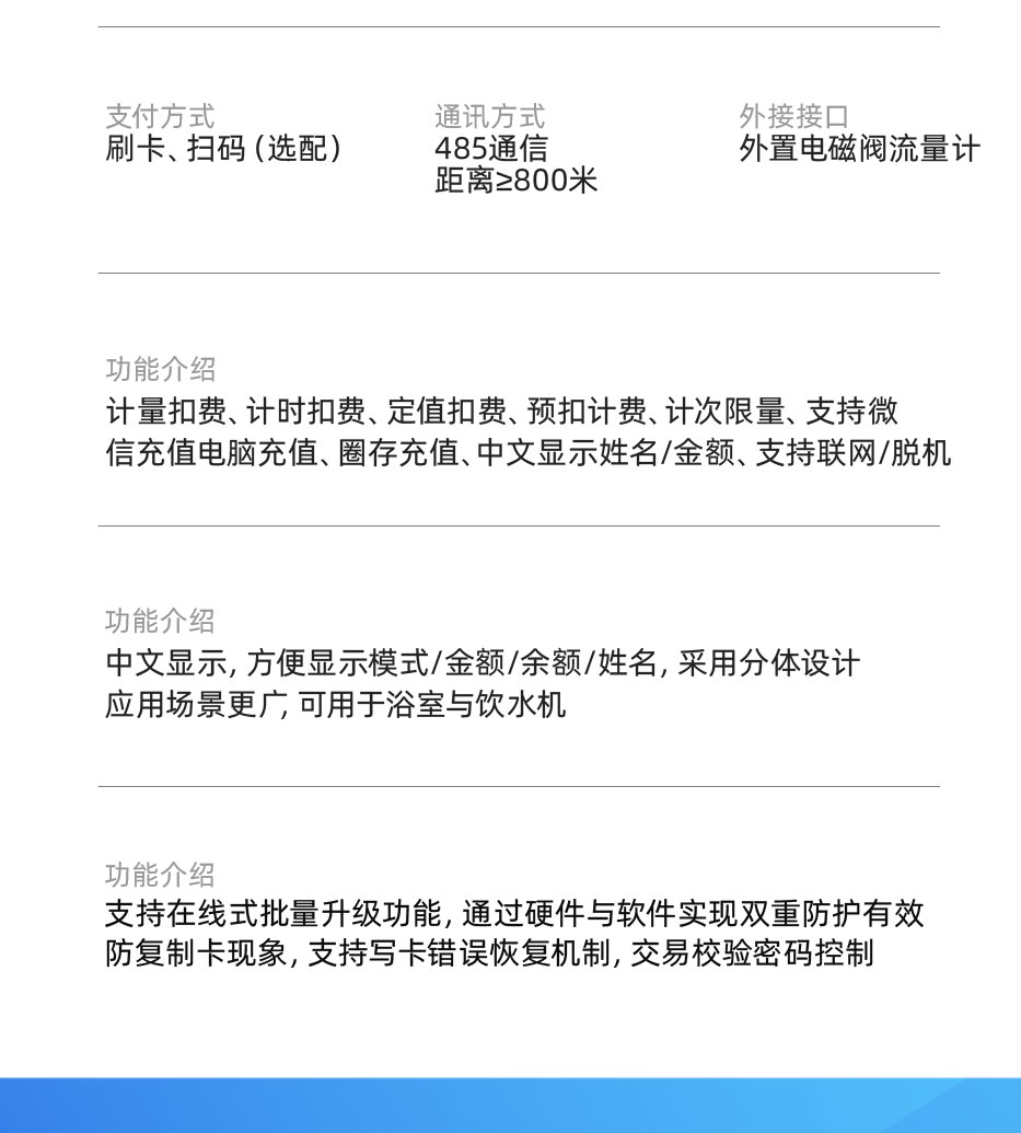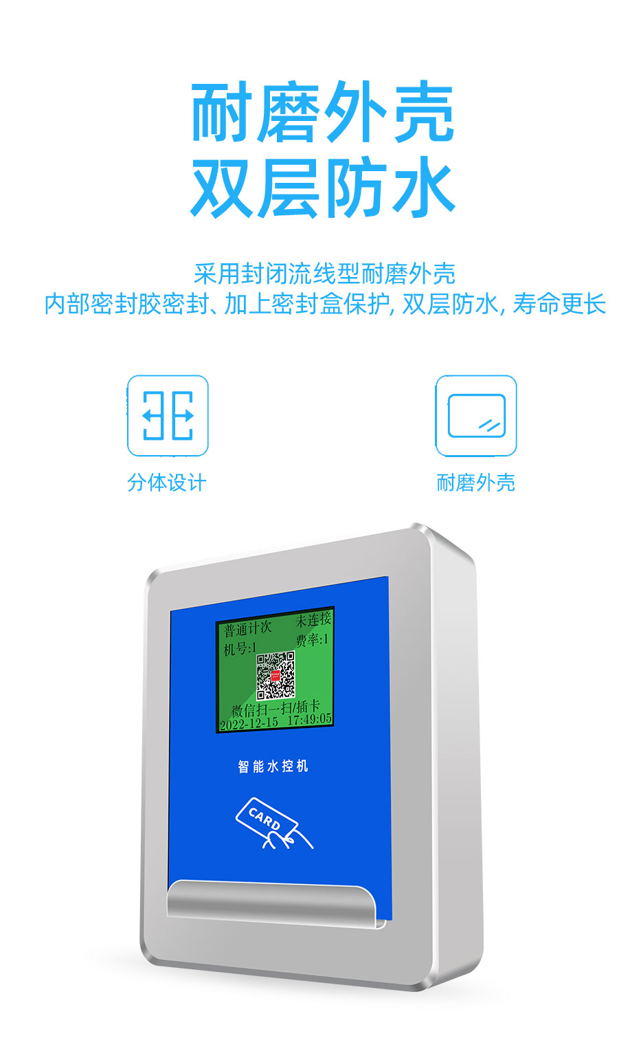 智能联网分体水控机S3系列是依时利品牌,自主研发生产的新一代节能水控智能终端产品,采用分体式设计,应用安装更广,配合高速处理器的结合,国际一流工业设计标准,追求极致品质,具有计量收费、定值收费、计时收费、计次限量、预扣收费等功能。可用于校园浴室、企业/园区澡堂、饮水机控制、公共浴室、酒店、健身房、出租屋等应用场景, 使客户的管理更高效、更智能、更省心。