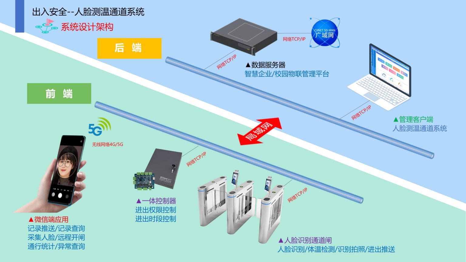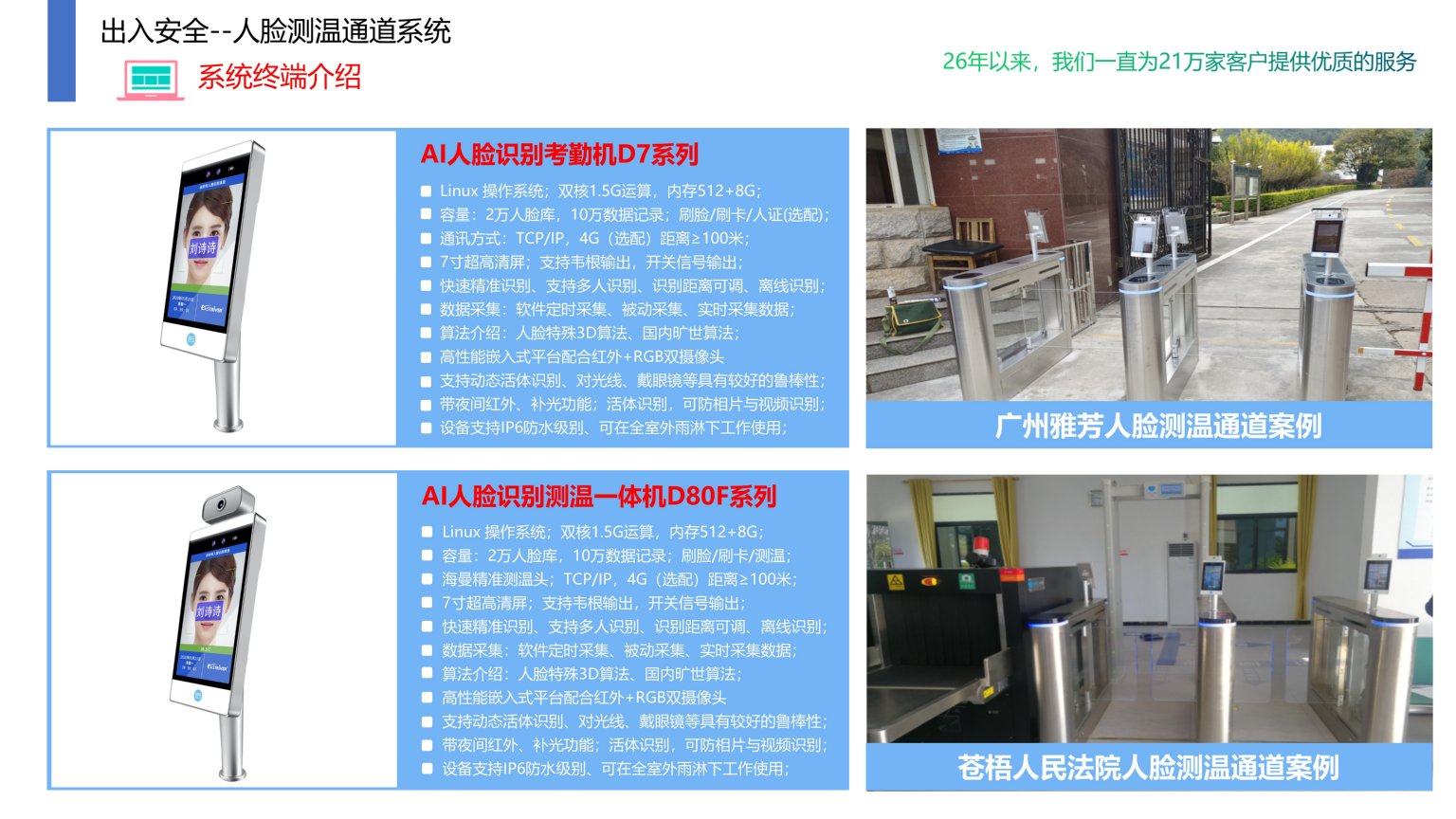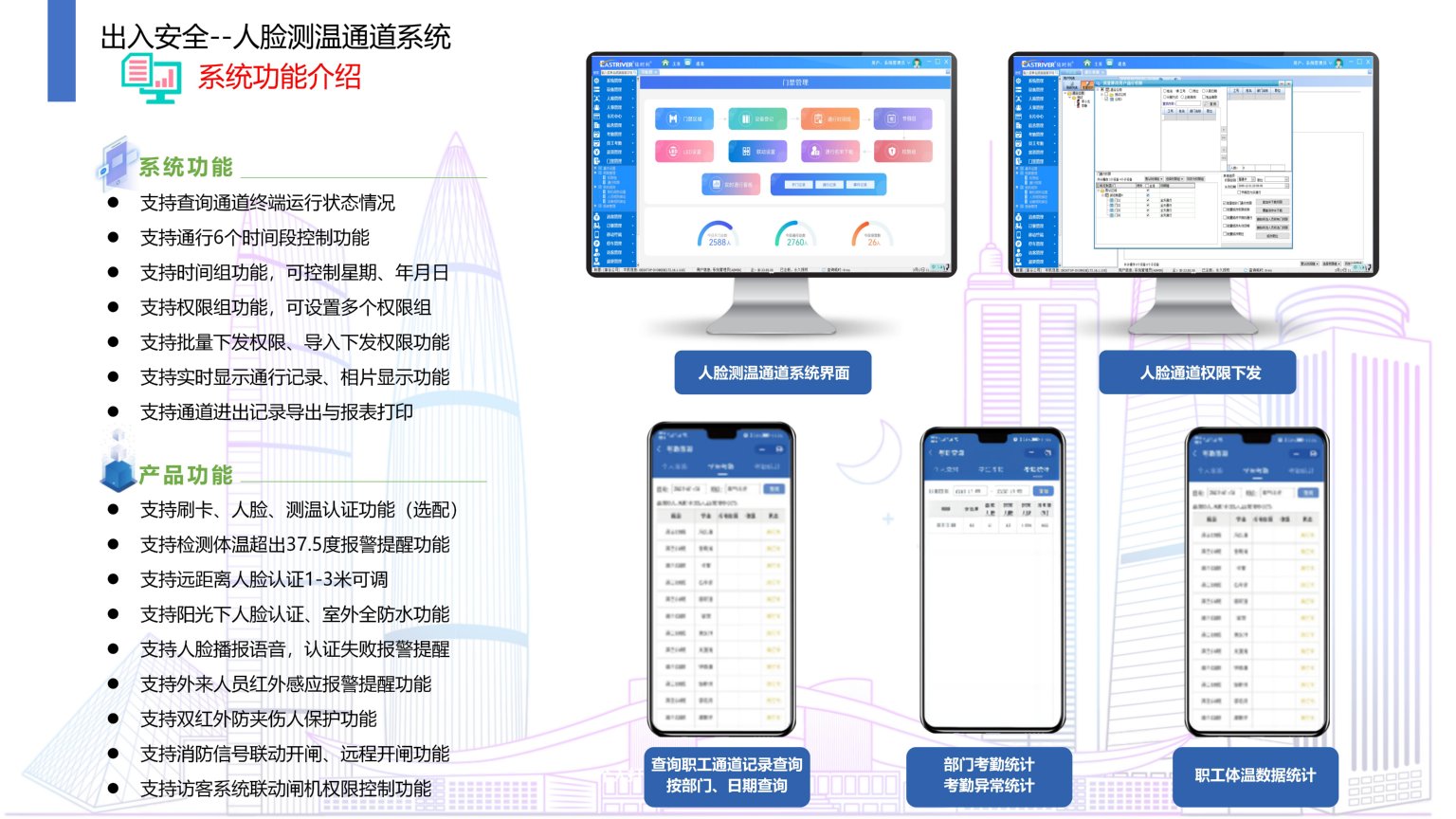 依时利企业/校园人脸测温通道系统是通过统一管理平台/数据库/终端/手机端来实现综合管理,实现职工进出大门时有效的人脸认证与测温检测,人脸通道闸机和门禁系统进行有效的联动,为企业/校园安防带来管理上的提升。有效控制通行秩序,使得出入口通行井然有序,方便人员出入管理。利用智能闸机和人脸设备对出入进行控制和管理,提高安全性与美观度,防止外来人员随意进出。