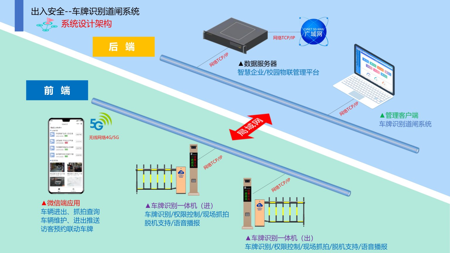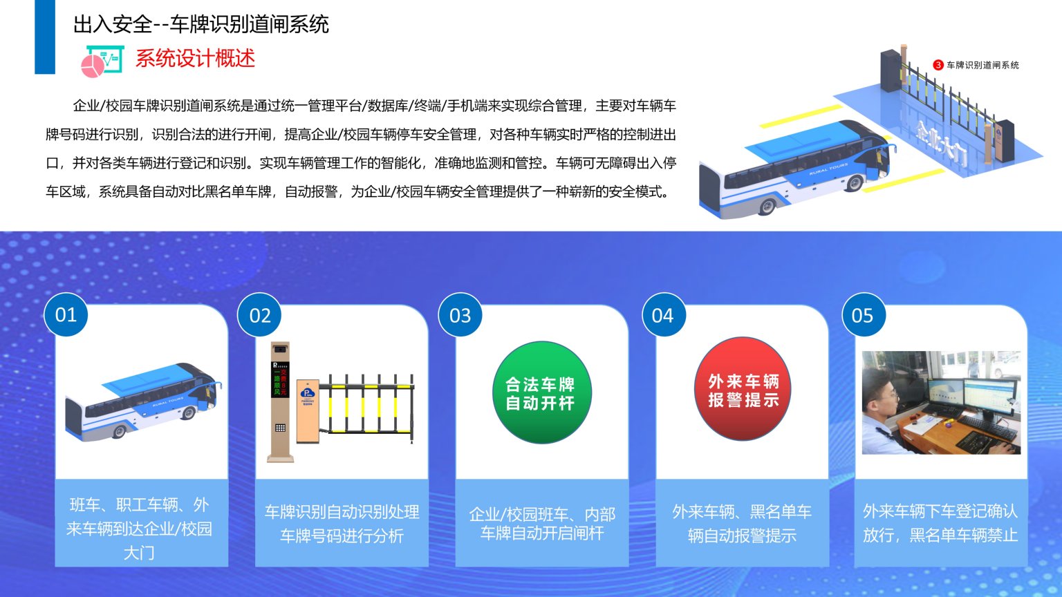 依时利企业/校园车牌识别道闸系统是通过统一管理平台/数据库/终端/手机端来实现综合管理,主要对车辆车牌号码进行识别,识别合法的进行开闸,提高企业/校园车辆停车安全管理,对各种车辆实时严格的控制进出口,并对各类车辆进行登记和识别。实现车辆管理工作的智能化,准确地监测和管控。车辆可无障碍出入停车区域,系统具备自动对比黑名单车牌,自动报警,为企业/校园车辆安全管理提供了一种崭新的安全模式。