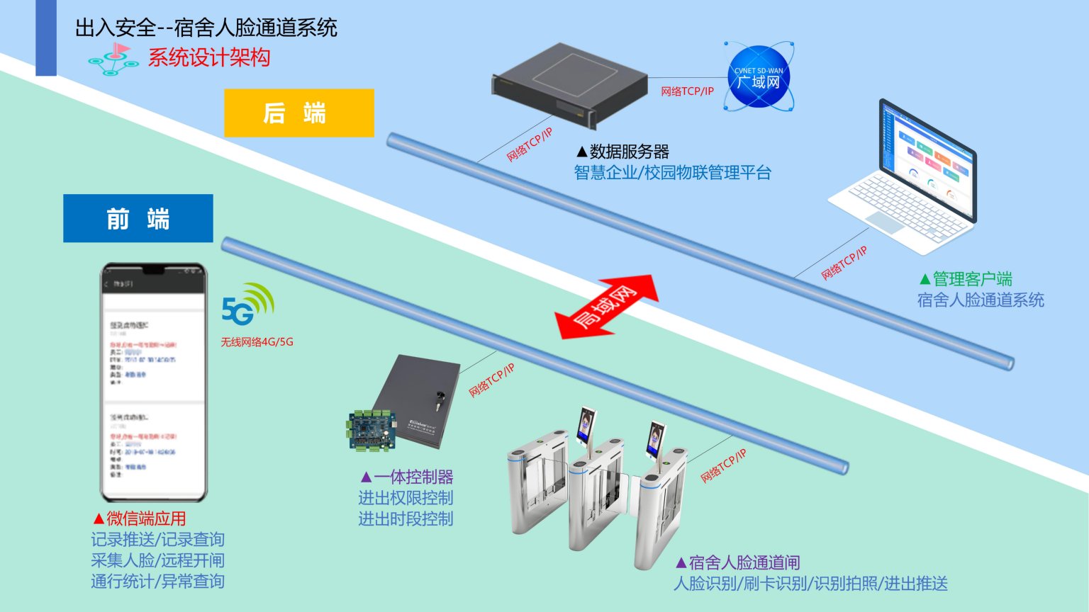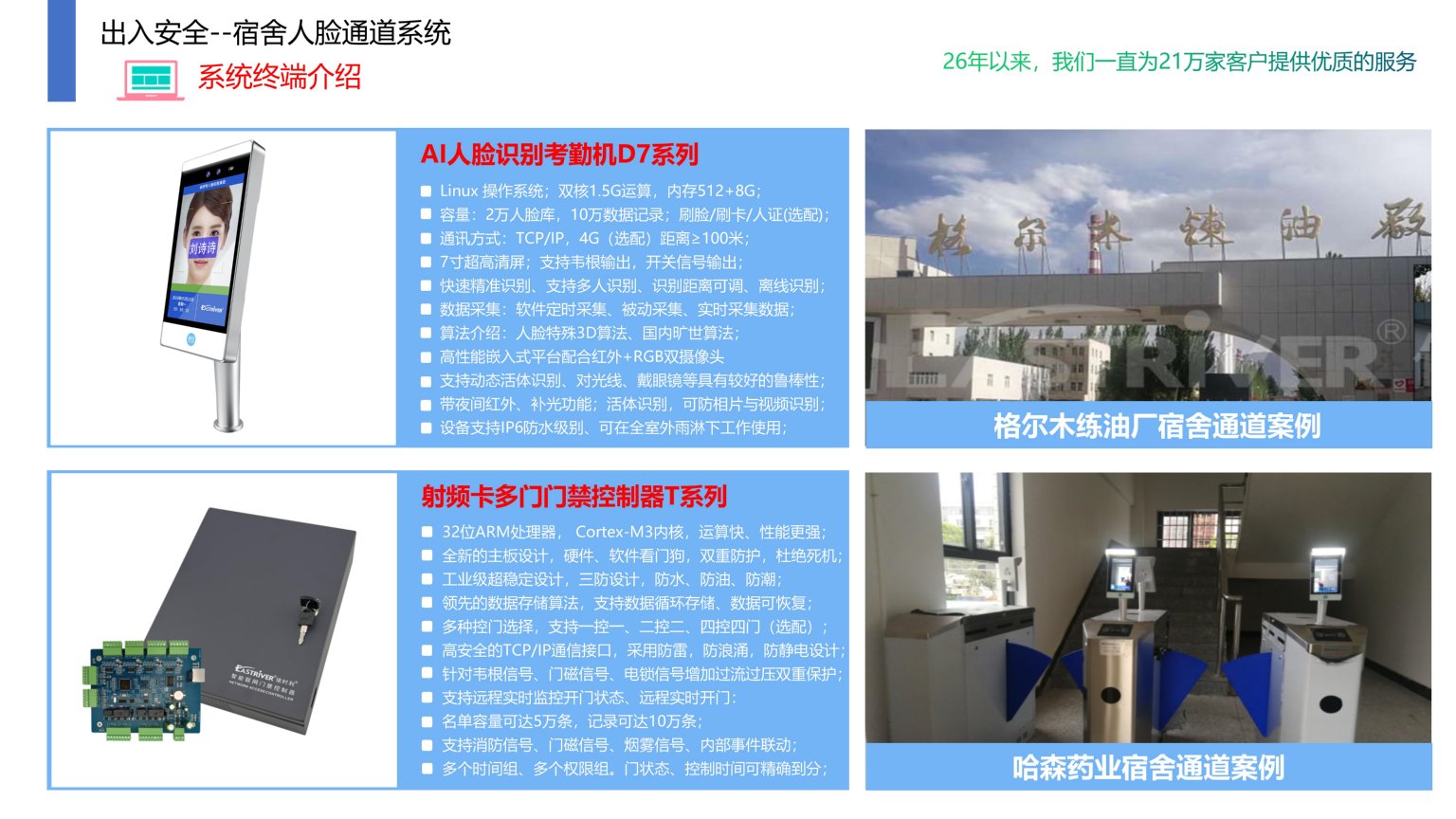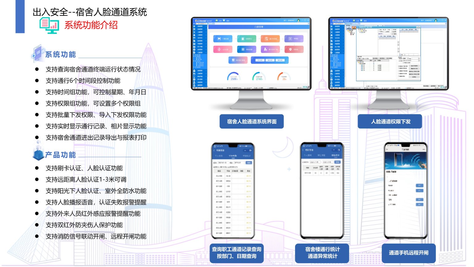 依时利企业/校园宿舍人脸通道系统是通过统一管理平台/数据库/终端/手机端来实现综合管理,实现职工进出宿舍楼有效的人脸或刷卡认证,人脸通道闸机和门禁系统进行有效的联动,为宿舍楼安防带来管理上的提升。有效控制通行秩序,使得宿舍出入口通行井然有序,方便人员出入管理。利用智能闸机和人脸设备对出入进行控制和管理,提高安全性与美观度,防止外来人员随意进出宿舍。