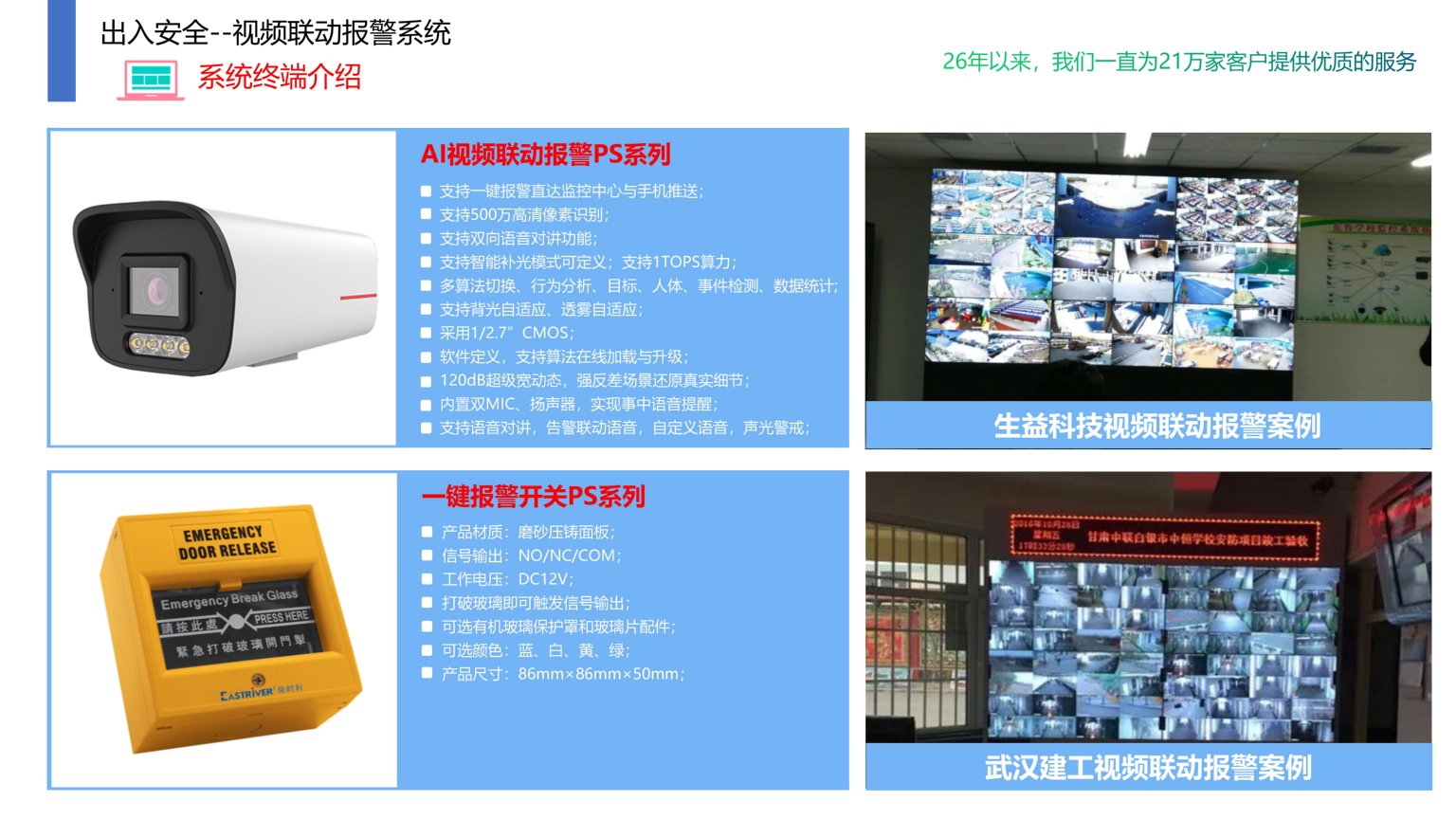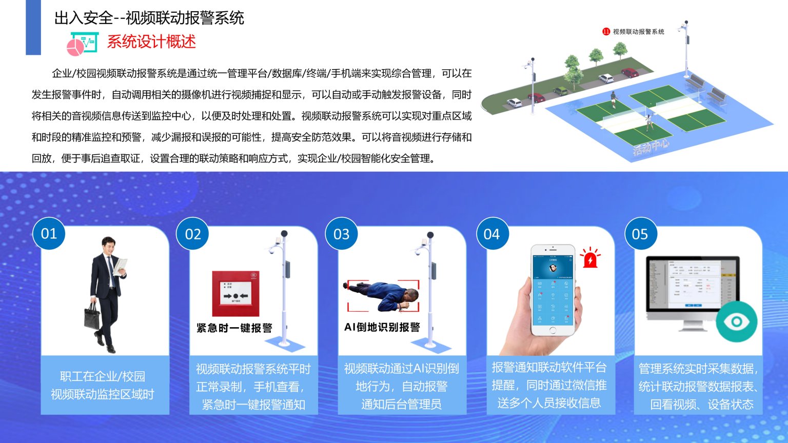 依时利企业/校园视频联动报警系统是通过统一管理平台/数据库/终端/手机端来实现综合管理,可以在发生报警事件时,自动调用相关的摄像机进行视频捕捉和显示,可以自动或手动触发报警设备,同时将相关的音视频信息传送到监控中心,以便及时处理和处置。视频联动报警系统可以实现对重点区域和时段的精准监控和预警,减少漏报和误报的可能性,提高安全防范效果。可以将音视频进行存储和回放,便于事后追查取证,设置合理的联动策略和响应方式,实现企业/校园智能化安全管理。