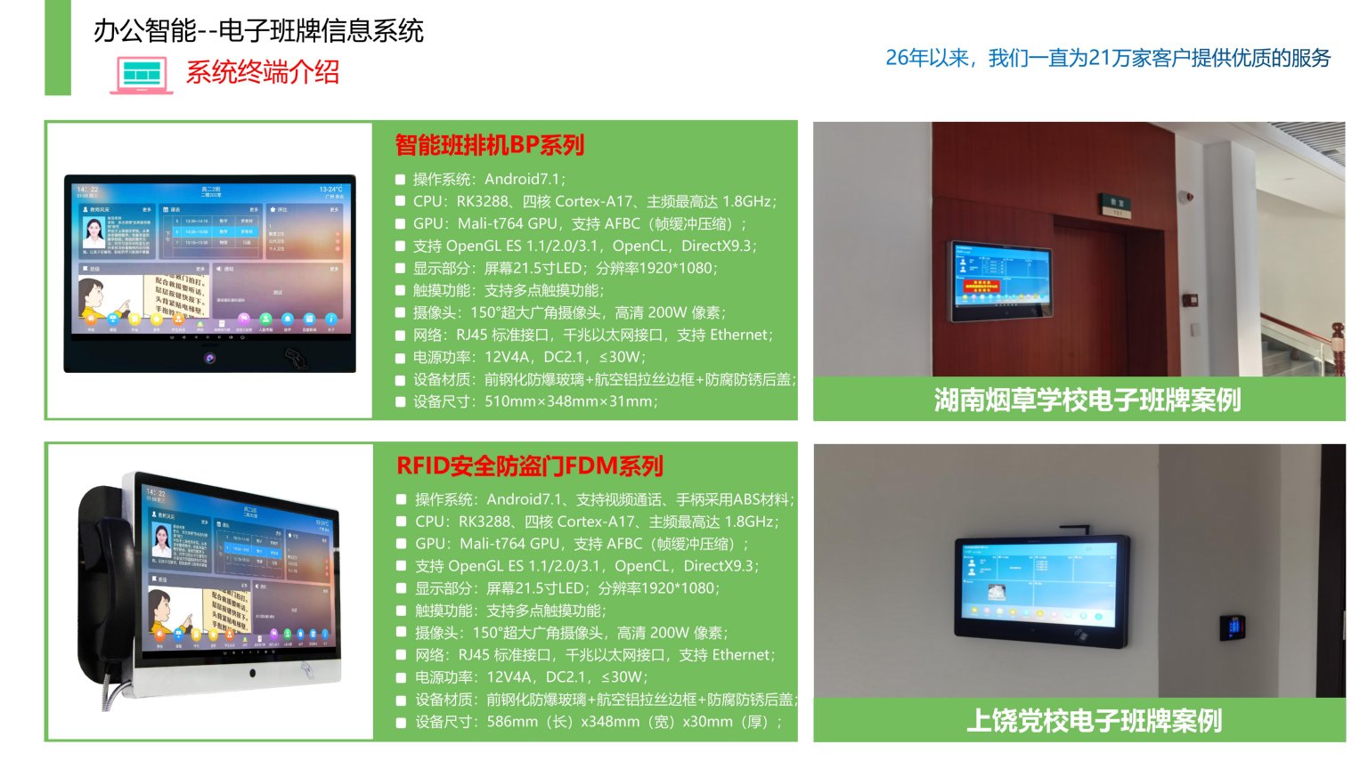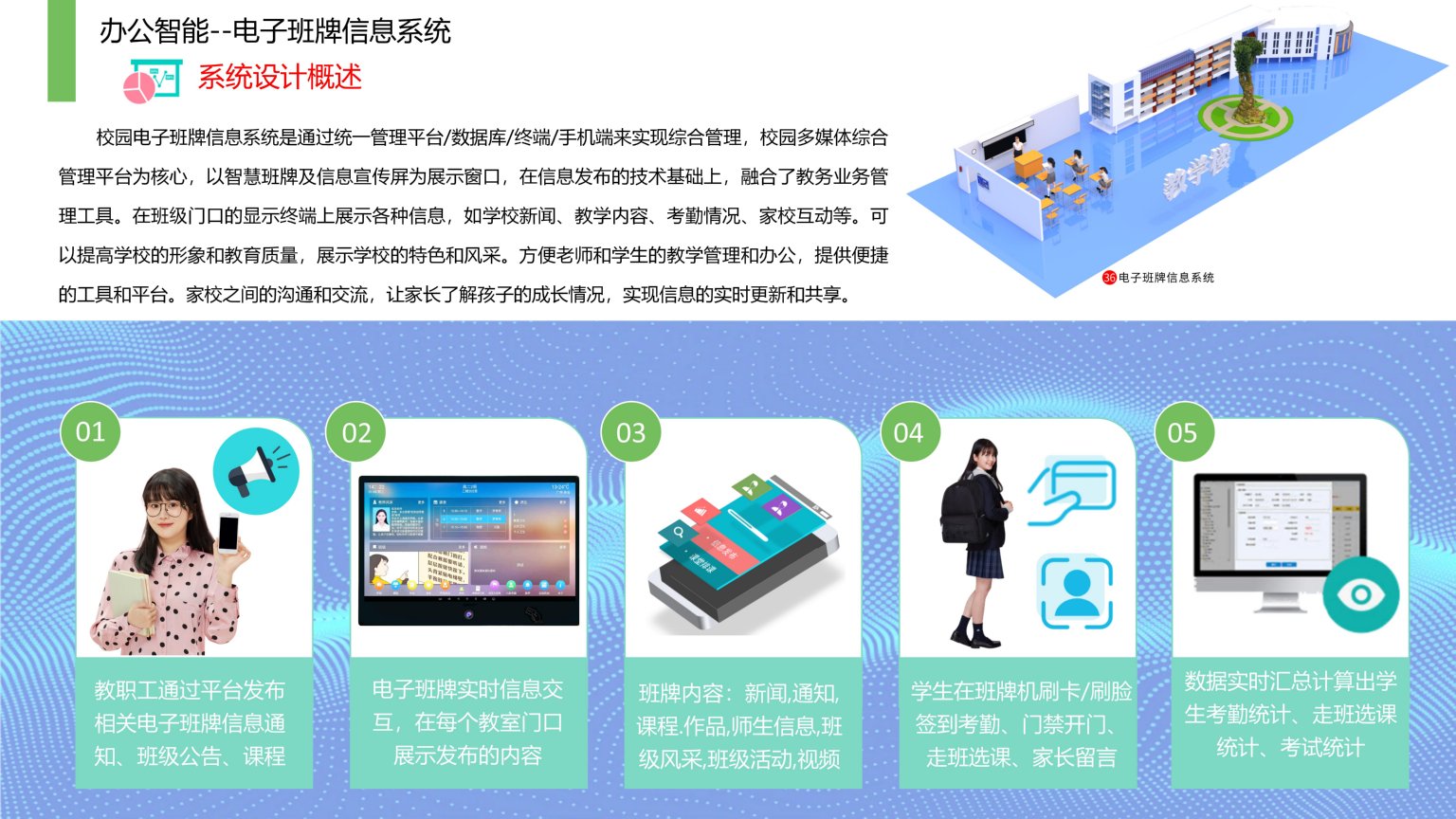 依时利校园电子班牌信息系统是通过统一管理平台/数据库/终端/手机端来实现综合管理,校园多媒体综合管理平台为核心,以智慧班牌及信息宣传屏为展示窗口,在信息发布的技术基础上,融合了教务业务管理工具。在班级门口的显示终端上展示各种信息,如学校新闻、教学内容、考勤情况、家校互动等。可以提高学校的形象和教育质量,展示学校的特色和风采。方便老师和学生的教学管理和办公,提供便捷的工具和平台。家校之间的沟通和交流,让家长了解孩子的成长情况,实现信息的实时更新和共享。