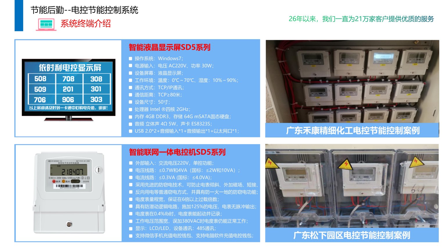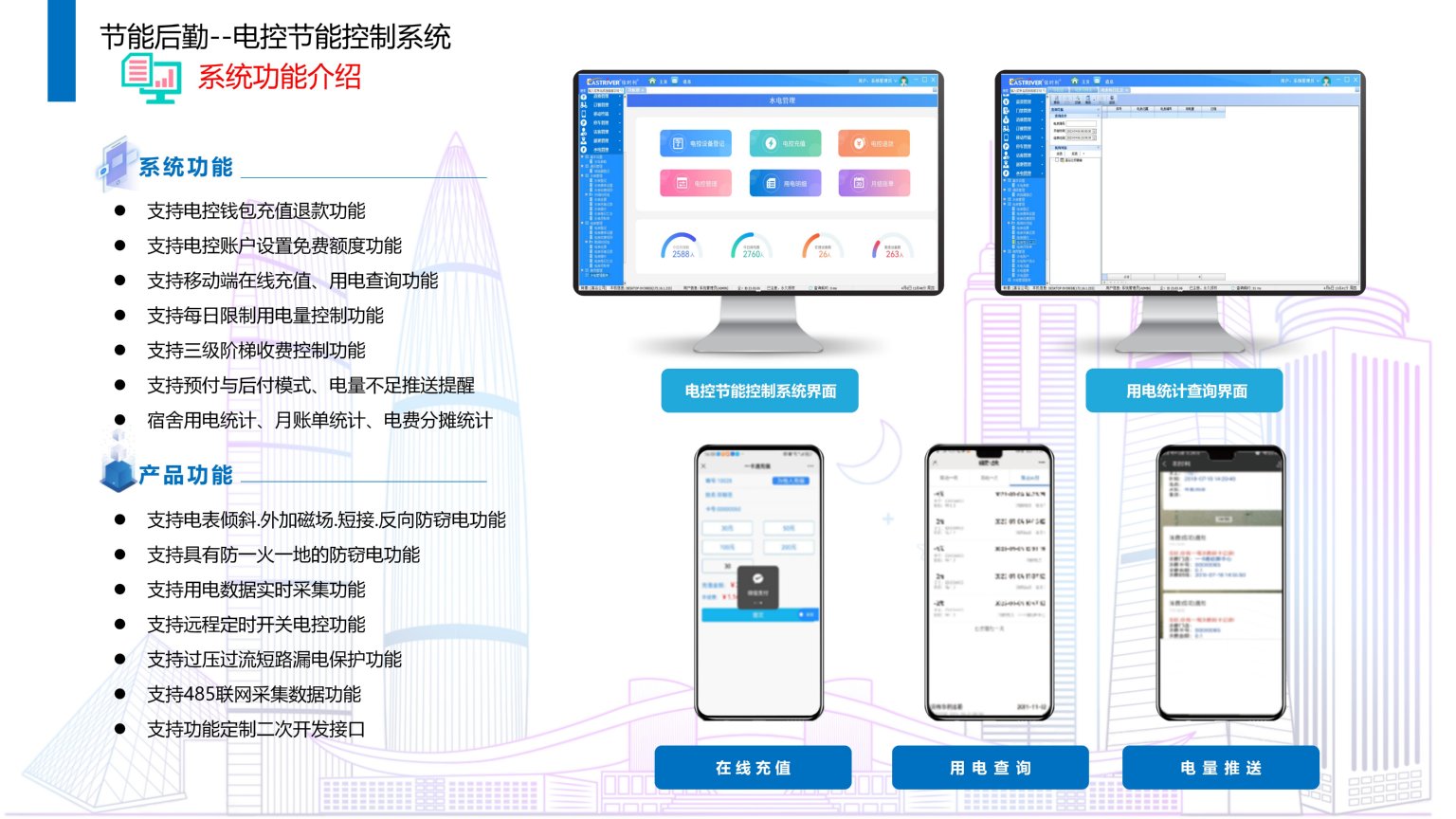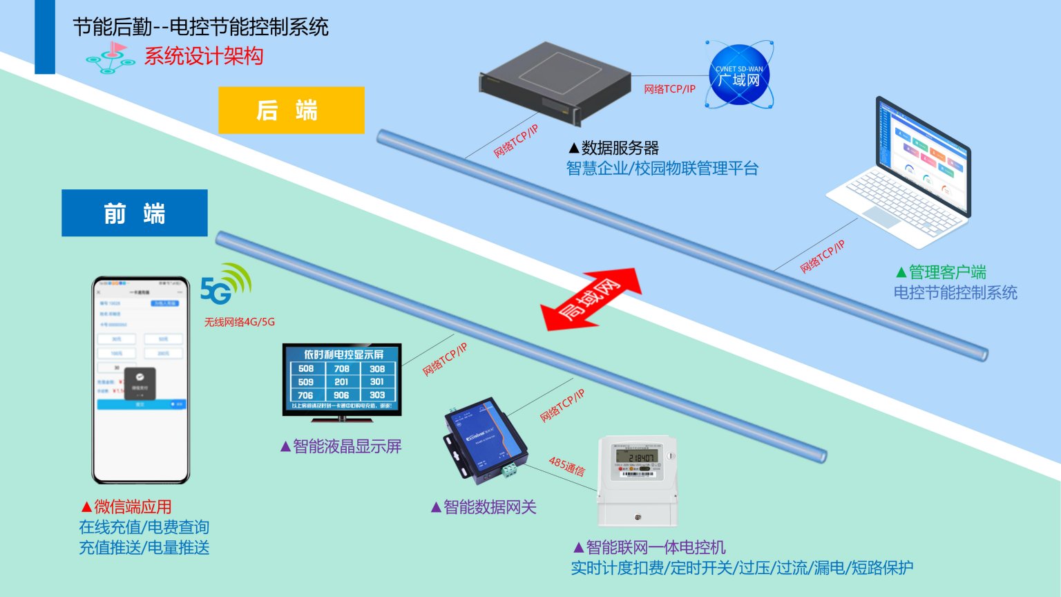 依时利企业/校园电控节能控制系统是通过统一管理平台/数据库/终端/手机端来实现综合管理,主要实现为企业/校园宿舍用电节电控制、宿舍用电缴费充值、预充值用电方式,远程开关控制、低电提醒、过压过流报警、短路与漏电保护功能,系统支持实时数据通信,实时数据采集,主要解决企业/校园用电环保节约,按需用电、科学计费、有效节约宝贵电力资源。电控系统由智能电表、数据网关、平台系统组成。实时了解用电情况,提高用电安全性和效率,提高用电舒适度和智能化水平。