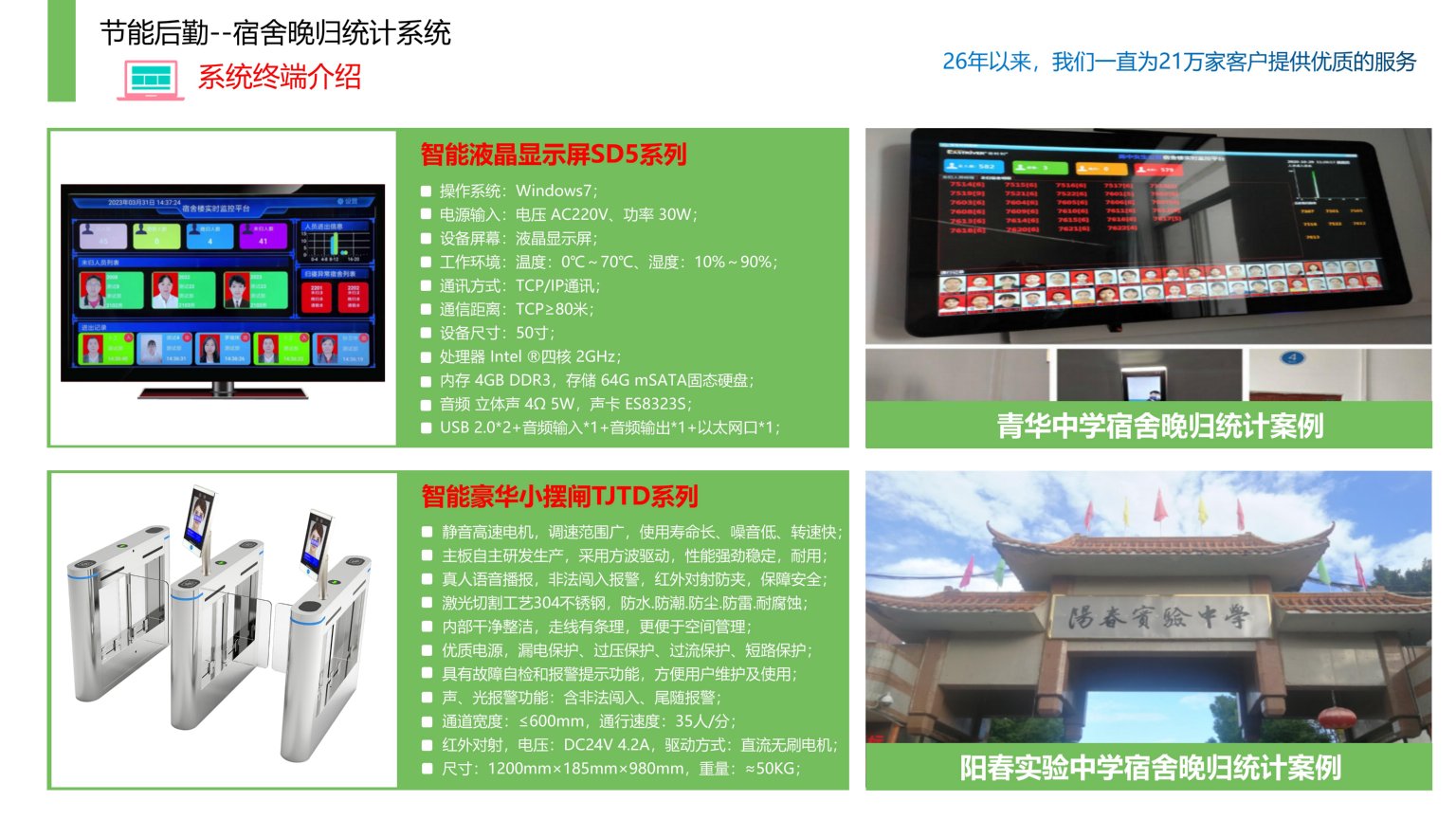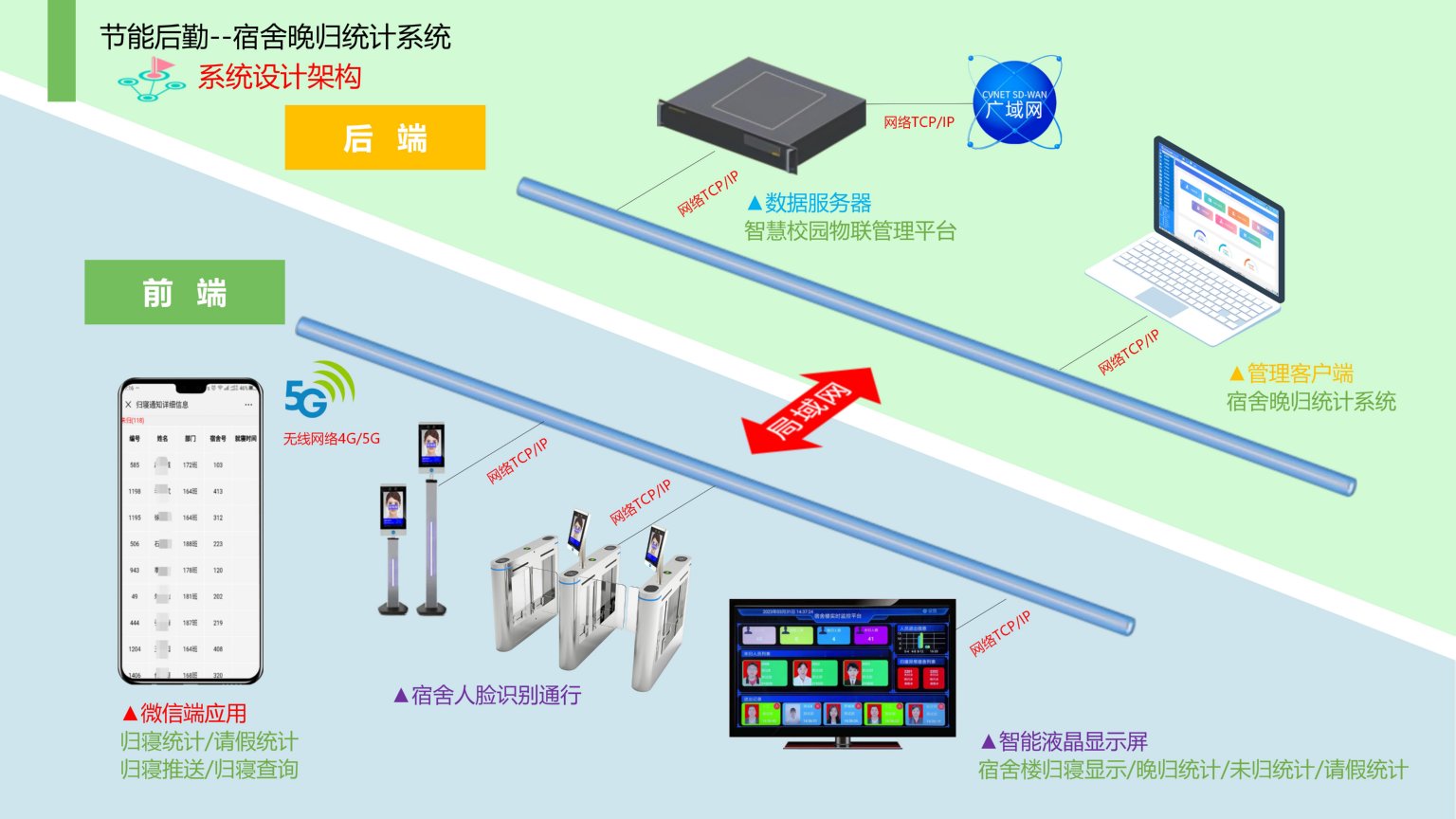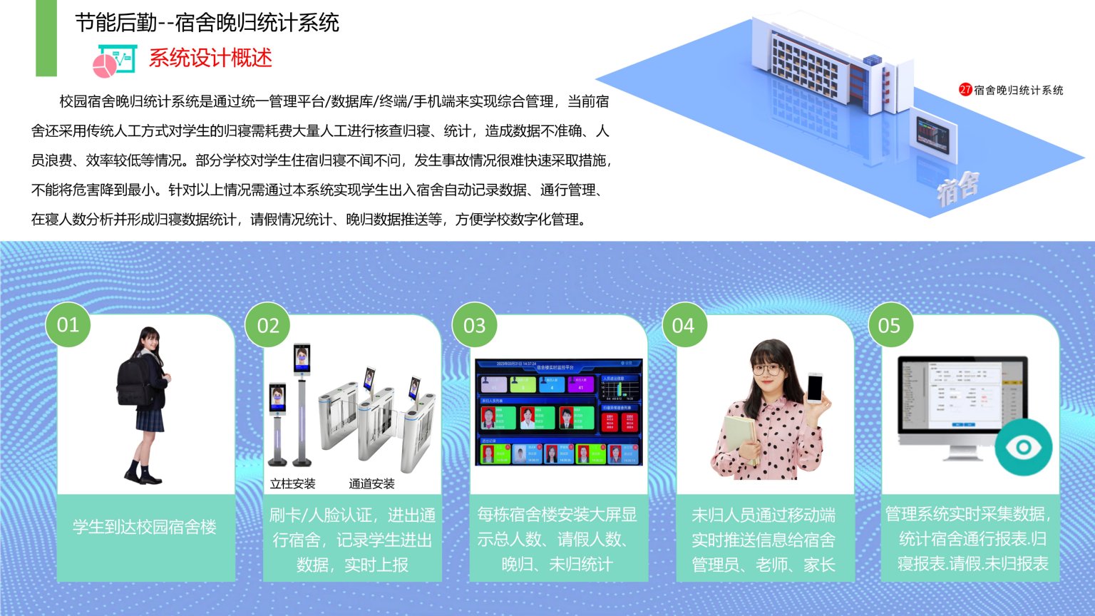 依时利校园宿舍晚归统计系统是通过统一管理平台/数据库/终端/手机端来实现综合管理,当前宿舍还采用传统人工方式对学生的归寝需耗费大量人工进行核查归寝、统计,造成数据不准确、人员浪费、效率较低等情况。部分学校对学生住宿归寝不闻不问,发生事故情况很难快速采取措施,不能将危害降到最小。针对以上情况需通过本系统实现学生出入宿舍自动记录数据、通行管理、在寝人数分析并形成归寝数据统计,请假情况统计、晚归数据推送等,方便学校数字化管理。
