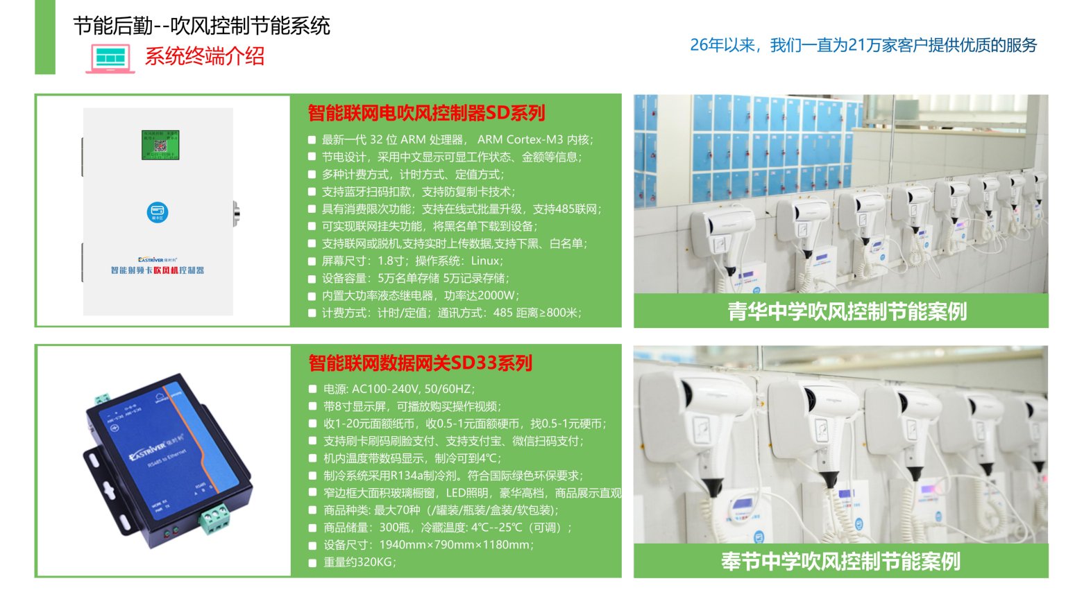 依时利校园吹风控制节能系统是通过统一管理平台/数据库/终端/手机端来实现综合管理,吹风控制消费系统是一种利用电吹风的工作时间来计算消费金额的系统。通过设置不同的时间与金额来调节电吹风的工作时长,以满足用户的不同需求。该系统还可以通过显示屏来显示消费信息,如剩余时间、已消费金额等,方便学生了解自己的消费情况,该系统可应用于宿舍、浴室、公共澡堂等场所,节约能源,提高效率,增加收入。